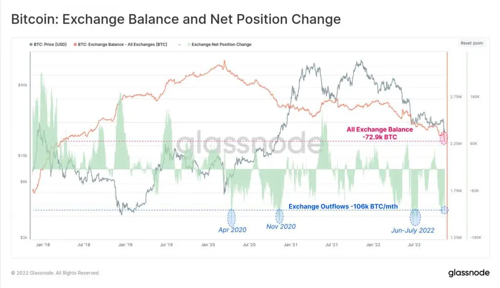 Еще один твит от Glassnode подтвердил, что снятие средств с криптобирж, связанное с переводами на самостоятельное хранение, колеблется на историческом максимуме около 106 000 BTC в месяц. Подобные уровни были отмечены только трижды в прошлом до этого: в апреле 2020 г., ноябре 2020 г., июне-июле 2022 г.».