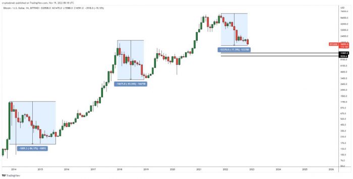Прогноз эксперта основан на данных о медвежьих трендах, господствовавших на рынке биткоина в периоды с 2014-го по 2015-й и с 2017-го по 2018-й. В этом году монета подешевела на 77% от исторического максимума, достигнутого в ноябре 2021-го.