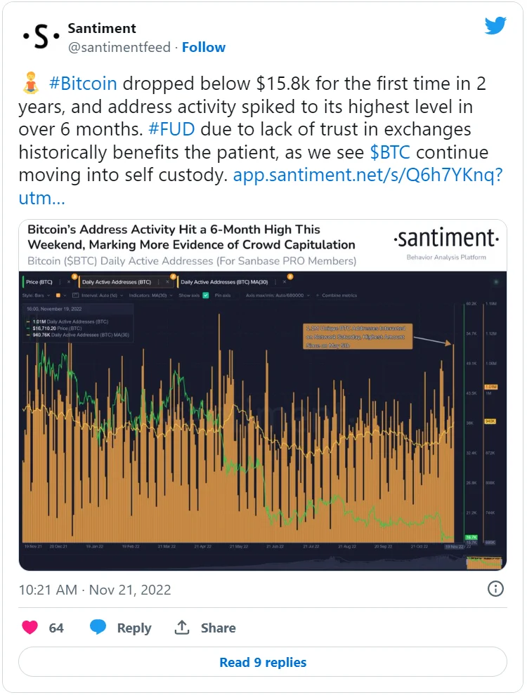 Что произошло? По данным аналитической компании Santiment, активность BTC-адресов достигла самого высокого уровня за последние шесть месяцев. Так, 20 ноября 1,1 млн уникальных адресов подключились к сети, что является самым высоким показателем с 5 мая. «Страх, неуверенность и сомнения» (FUD) из-за отсутствия доверия к биржам исторически приносят пользу биткоину, а пользователи переходят на самостоятельное хранение актива, отметили эксперты. На 14:00 мск BTC торгуется по $16 147, за сутки снизившись на 2,28%, по данным криптобиржи Binance.