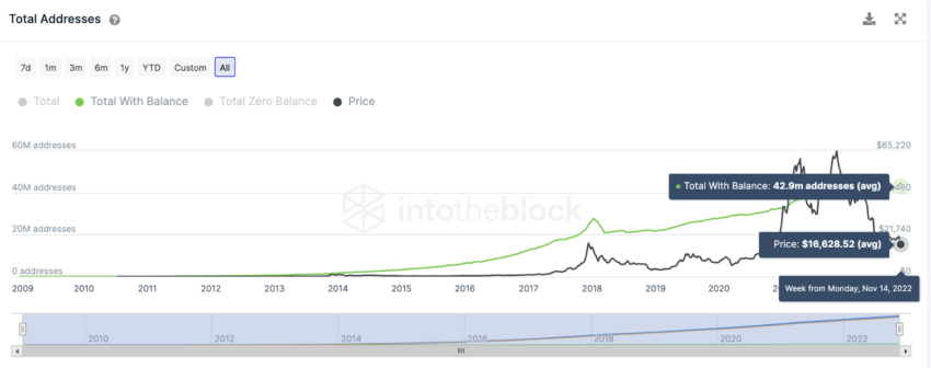 Если не принимать во внимание вызванный Covid-19 обвал в марте 2020 года, то можно утверждать, что процент несущих убытки биткоин-кошельков снижается в каждом медвежьем цикле. Это может быть связано и с тем, что общее количество кошельков с балансом (зеленая линия) неуклонно растет с момента создания BTC.