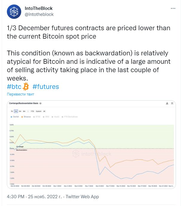 По данным аналитической компании IntoTheBlock, декабрьские фьючерсные контракты на биткоины продаются по более низкой цене, чем спотовая цена BTC. В твите говорится, что несмотря на то, что это указывает на большую активность трейдеров в продажах, возможность арбитража всё ещё существует.