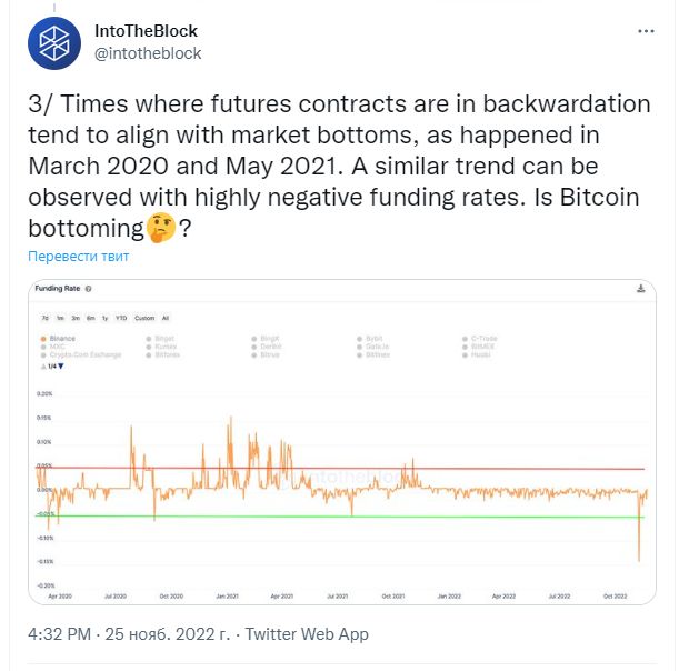 В IntoTheBlock заявили, что, когда фьючерсные контракты переходят в бэквордацию, это обычно совпадает с моментом, когда рынки достигают дна. То же самое произошло с биткоином весной 2021 и 2020 годов.