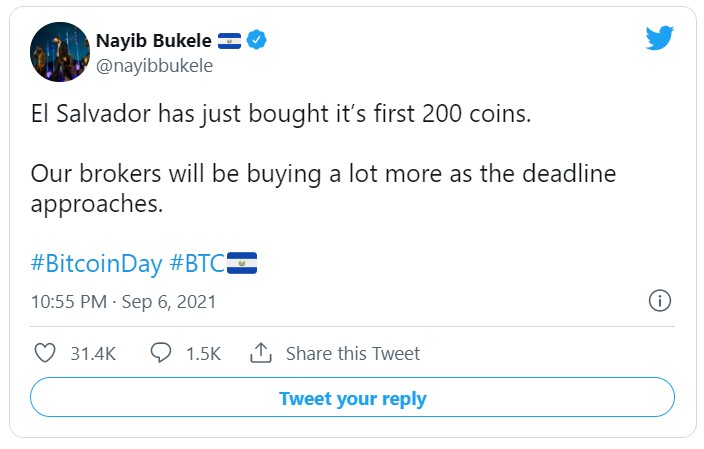 Букеле отметил, что страна будет покупать больше биткоинов по мере приближения крайнего срока, чтобы Сальвадор стал первой страной, официально признавшей криптовалюту в качестве законного платежного средства. В понедельник днем президент написал в Твиттере: