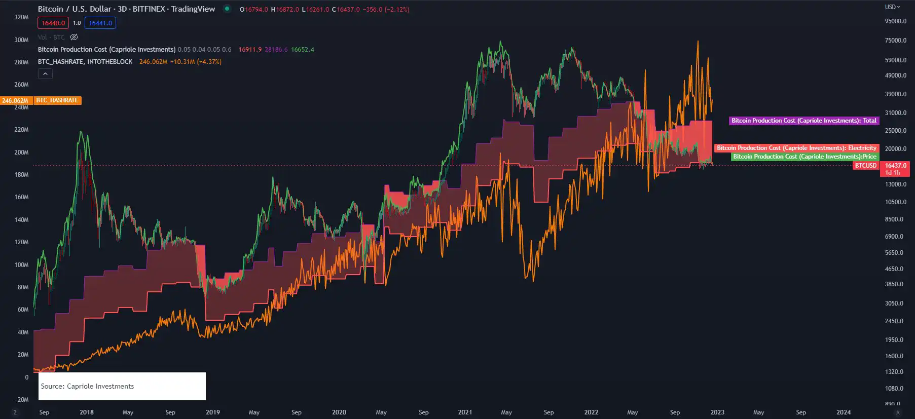«Индикатор ниже рисует общую картину соотношения курса BTC и стоимости работы майнера. Очевидно, что здесь есть множество переменных, и некоторые майнеры могут иметь значительно более низкие средние затраты, но это заставляет задуматься, сколько еще осталось, прежде чем мы увидим, как кто-то капитулирует»