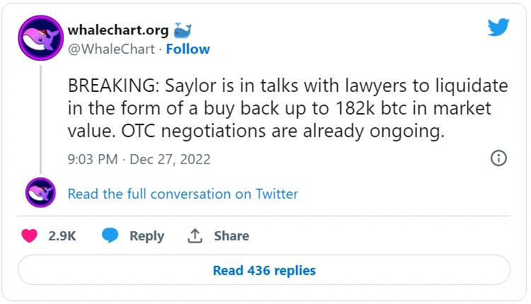Что произошло? Новостной аккаунт WhaleChart опубликовал в Twitter информацию о том, что основатель и экс-глава компании-разработчика аналитического ПО MicroStrategy Майкл Сейлор ведет переговоры с юристами о продаже 182 000 биткоинов (около 3,03 млрд долларов по курсу Binance на 28 декабря) на внебиржевом рынке (OTC).