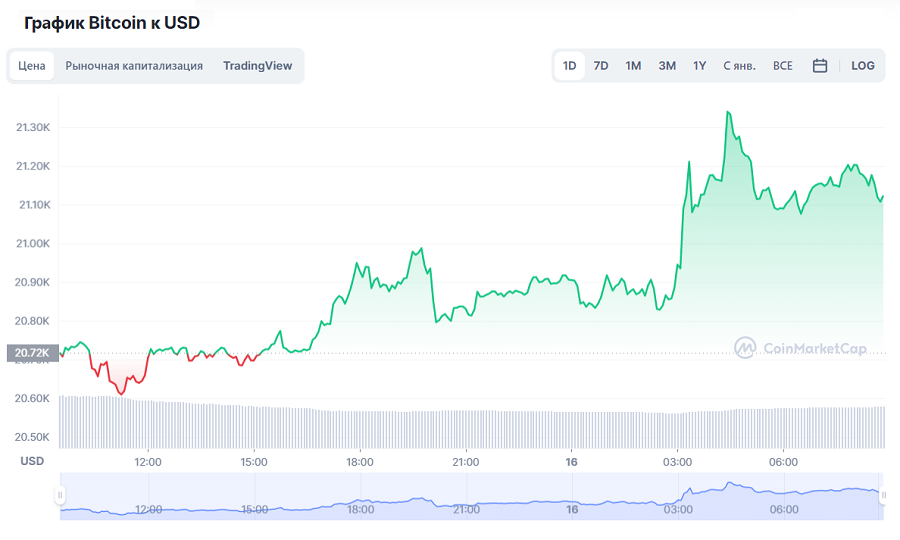 В первой половине дня биткоин на рынках торговался на уровне 21 120,39 доллара США, за последние сутки данная валюта выросла на 1,96%.
