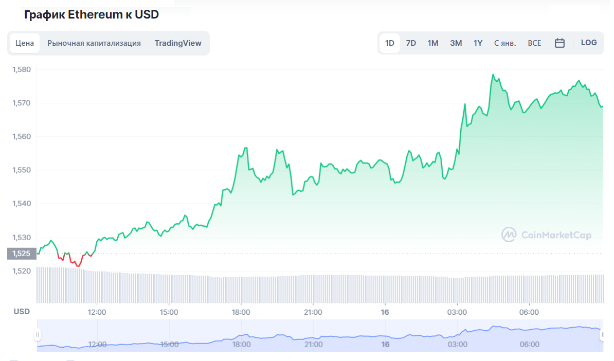 Вслед за биткоином к росту сегодня перешел Ethereum, за сутки эта монета выросла на 2,78% до уровня 1 567,96 доллара США, а по итогам недели ее рост составил 19,69%.