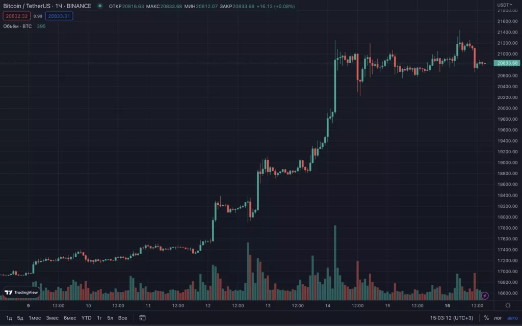 В тот же день котировки цифрового золота впервые с середины декабря 2022 года превысили $17 000. Биткоин продолжил рост и протестировал отметку $21 000. На момент написания актив торгуется на уровне $20 800.