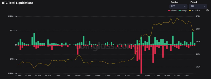 Перед резким падением 9 февраля цена биткоина уже откатилась на 5% от локального максимума в $24 000. Но соотношение реализованной прибыли и убытков на тот момент все еще оставалось положительным. Таким образом, первое снижение было результатом фиксации прибыли теми, кто покупал BTC в начале года.