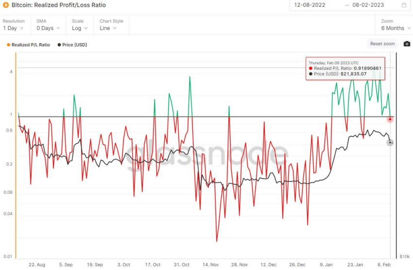 Согласно данным Glassnode, 9 февраля соотношение между реализованной прибылью и убытками держателей биткоина (BTC) впервые за две недели упало ниже 1.
