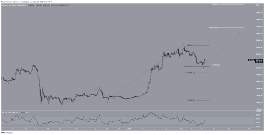Волновой график предполагает, что биткоин сейчас находится в четвертой волне пятиволнового движения. Две основные вершины пятой волны находятся на уровнях $26 845 и $30 200. Однако пока неясно, закончилась ли четвертая волна или цена BTC снизится до уровня поддержки 0,5 Фибоначчи на отметке $20 288. Более того, падение ниже максимума первой волны (красная линия) на уровне $18 400 аннулирует весь бычий прогноз и направит актив к $15 000.