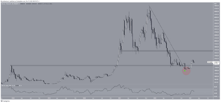 На этой неделе биткоин сохраняет решительно бычий настрой. Цена главной криптовалюты отбилась от долгосрочной нисходящей линии сопротивления, после чего подтвердила ее в качестве поддержки (зеленый значок). После этого актив вернулся к горизонтальной области $19300 — это значение считается критически важным, поскольку в 2017 году оно выступало в качестве исторического максимума, а в июне 2022 года превратилось в поддержку.