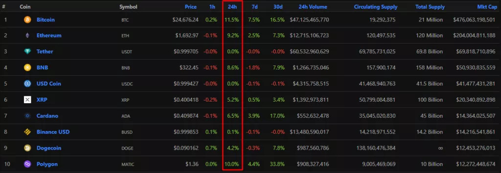 Растущий биткоин оживил остальной рынок. Ниже представлены данные по десяти наиболее капитализированным криптоактивам: