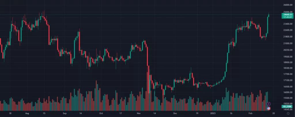 Первая криптовалюта достигла отметки $24 900, соответствующей ценовым значениям августа прошлого года.