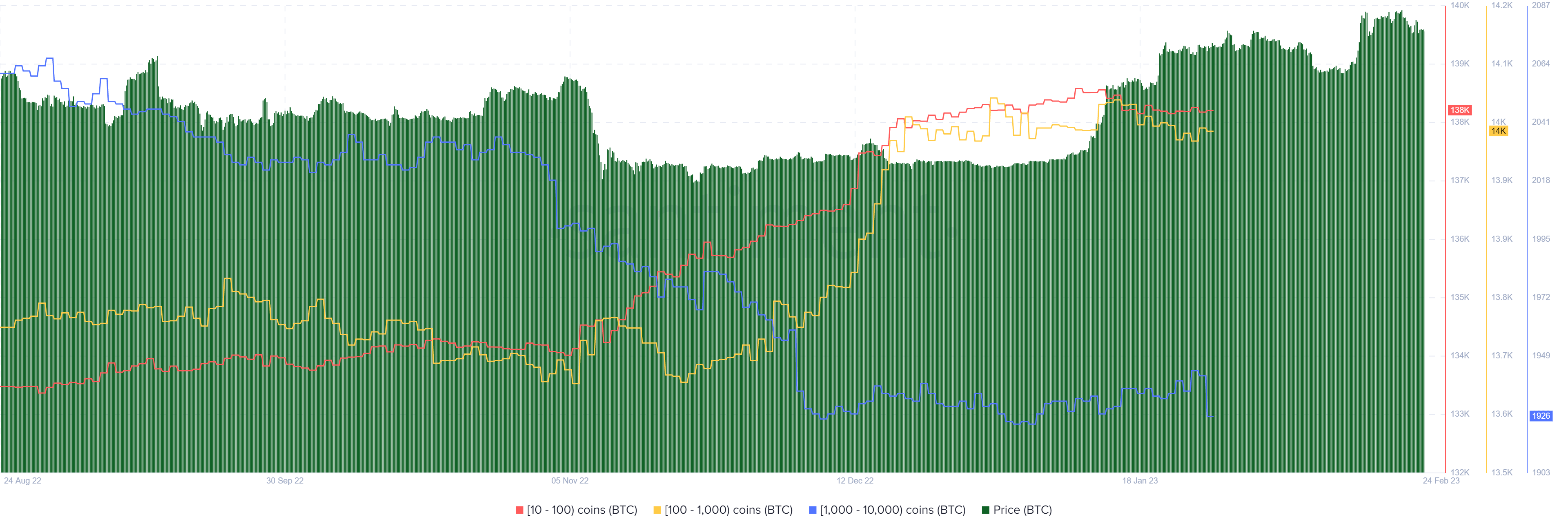 Ослабление волатильности биткоина снизило интерес к нему со стороны крупных адресов, контролирующих от 100 до 10 000 BTC.
