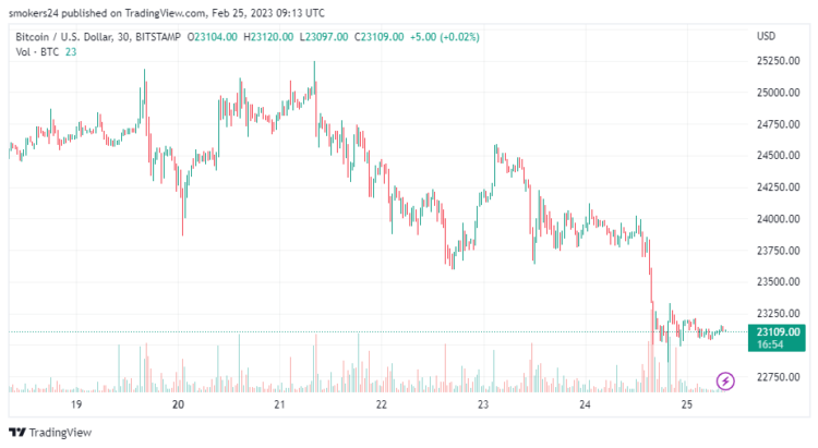 Биткоин (BTC) с середины февраля торгуется в узком диапазоне от $23 000 до $25 000.