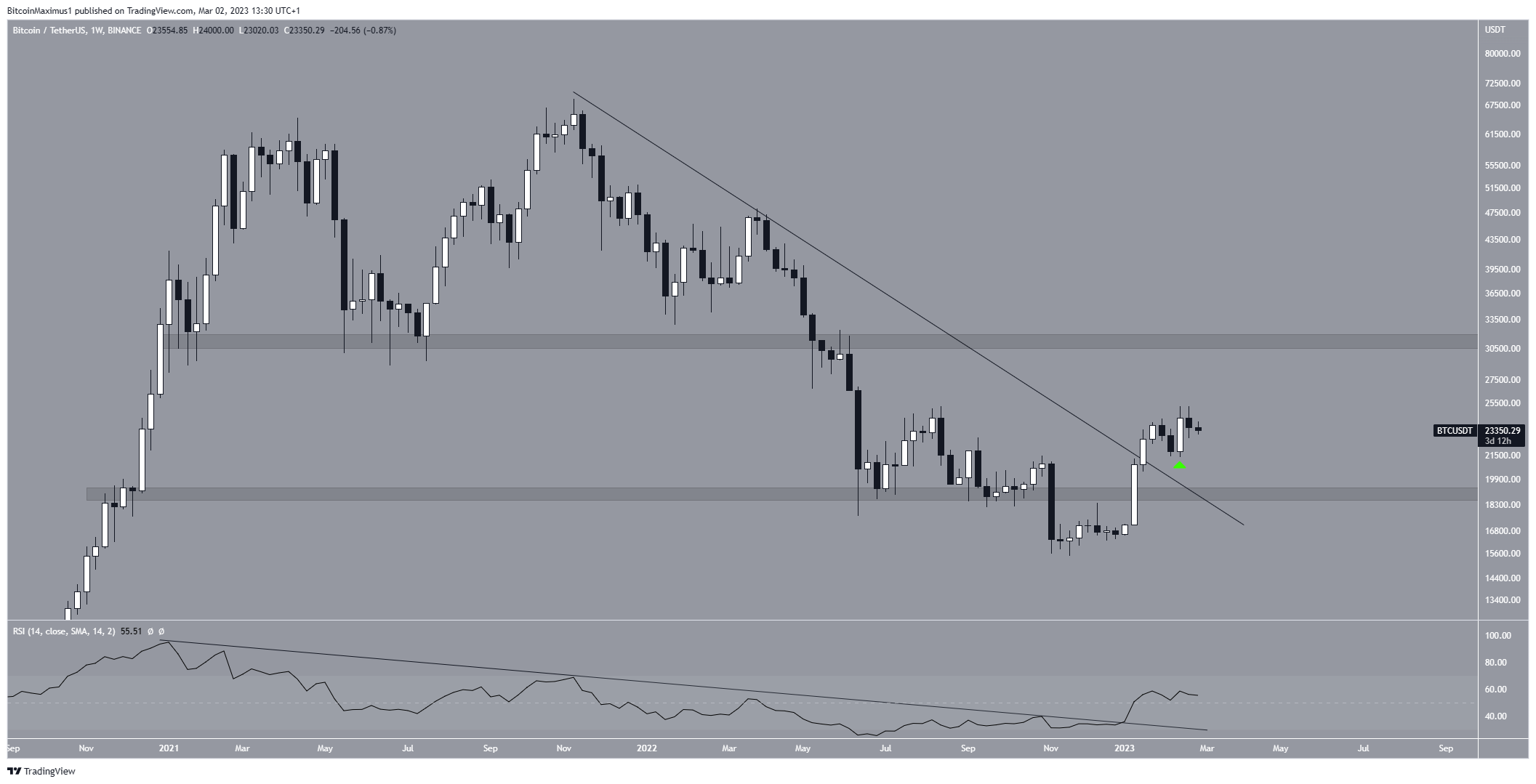 Во-первых, биткоин совершил бычий прорыв линии долгосрочного нисходящего сопротивления, построенной от исторического максимума. Во-вторых, цена восстановилась над областью горизонтальной поддержки $19 000, ниже которой она просела в июне 2022 года. В-третьих, недельный RSI прорвался выше линии нисходящего сопротивления и поднялся выше отметки 50. И, наконец, две недели назад BTC сформировал свечу бычьего поглощения (зеленый значок).