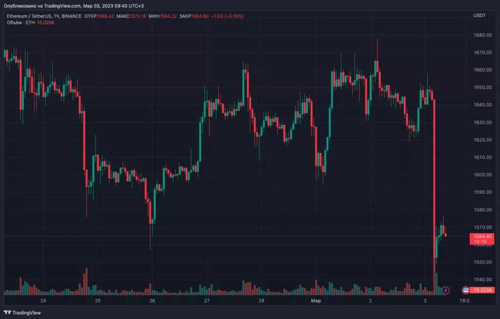 Вторая по капитализации криптовалюта просела на 4,7%. Цена рухнула с отметок выше $1640 до текущих $1564.