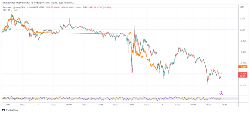 Фондовый рынок, за которым повторяет крипта, отреагировал на слова Пауэлла падением. Следом, отрицательную динамику также продемонстрировал биткоин.