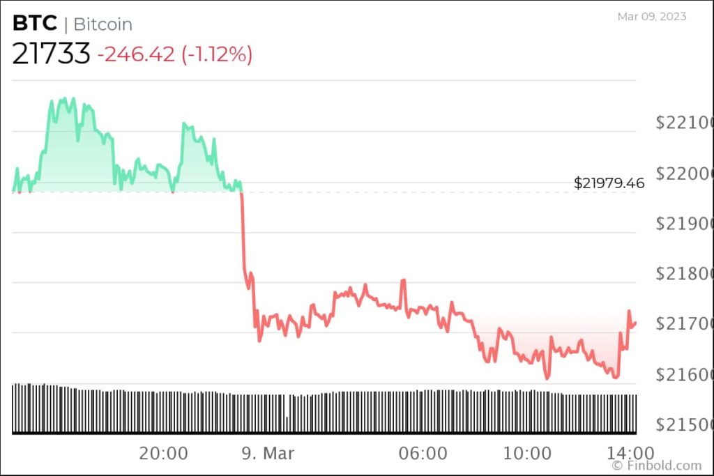 За последние 24 часа биткоин торговался на максимуме $ 22 198 и упал до $ 21 588. В настоящее время главная криптовалюта торгуется на уровне $ 21 733 при рыночной капитализации в $ 420 млрд.