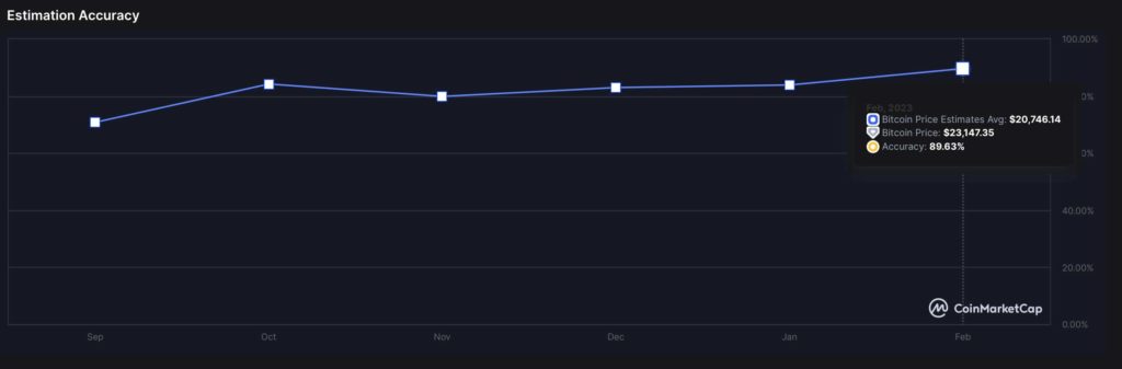 Кроме оценок искусственного интеллекта внимания заслуживают оценки сообщества на CoinMarketCap, точность прогнозов которых за последние шесть месяцев достигает 81%. Добавим, что точность последней оценки на конец февраля составила 89,63%.