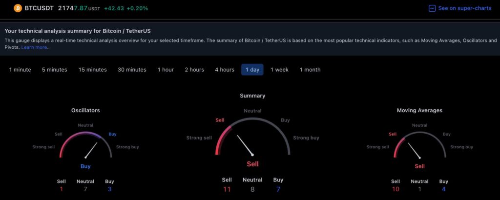 Технический анализ биткоина на однодневных индикаторах TradingView остаётся неоднозначным: сводка совпадает с настроением «продавать» на уровне 11 в результате того, что осцилляторы указывают на «покупку» на уровне 3, а скользящие средние (MA) говорят о «продаже» на уровне 10.
