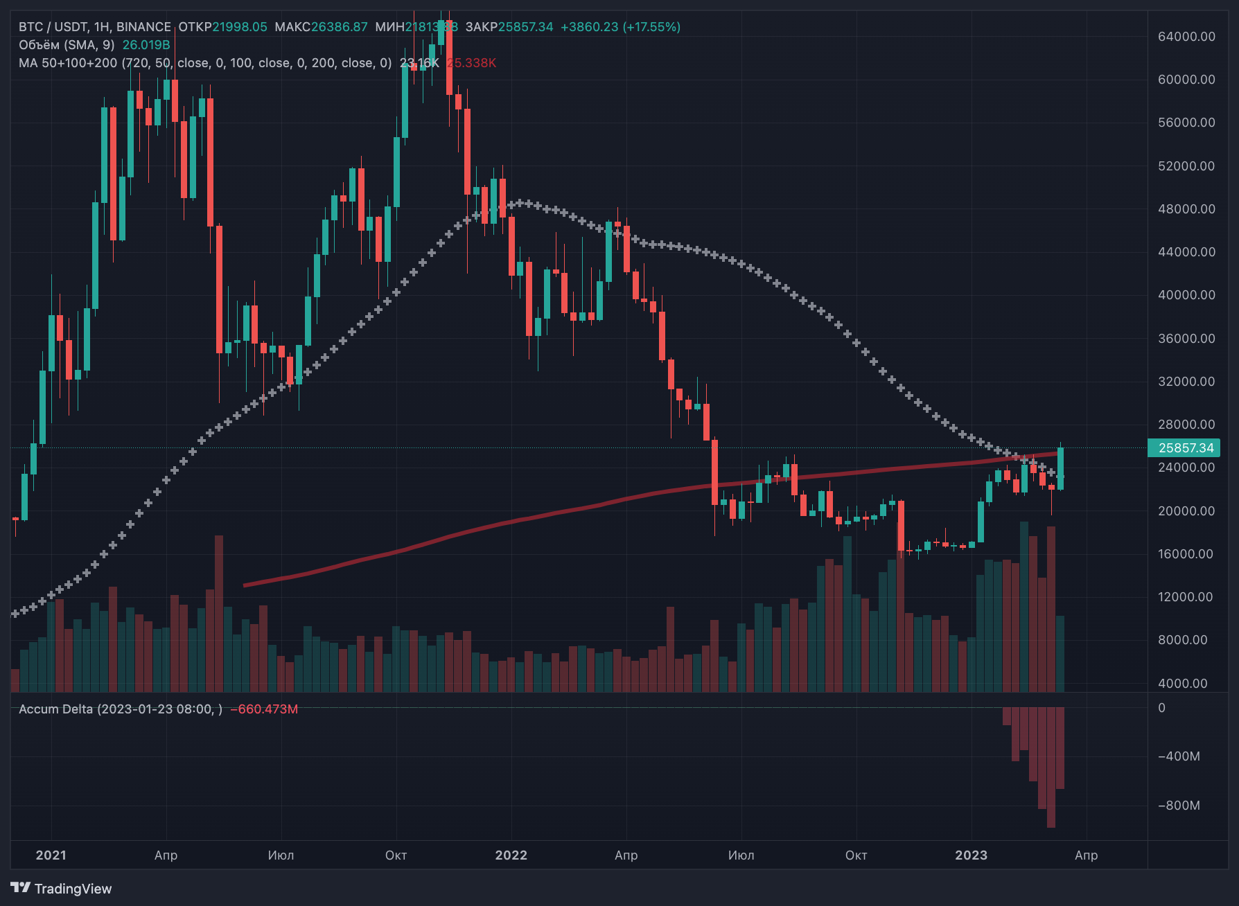 Биткоин отреагировал на снижение инфляции продолжением ралли. По данным скринера криптовалют Cryptovizor, определяющего рыночную цену BTC/USD по результатам торгов на крупнейших спотовых биржах, на момент публикации, актив достиг максимума этого на отметке $26 389. При этом биткоин преодолел ключевой уровень 200-недельной скользящей средней (200WMA, красная линия на графике), что является важным признаком бычьего рынка криптовалюты.
