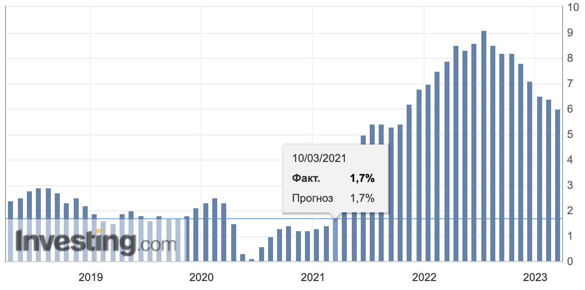 Февральский индекс (CPI) полностью соответствует прогнозу — 6,0% (в январе было 6,4%).