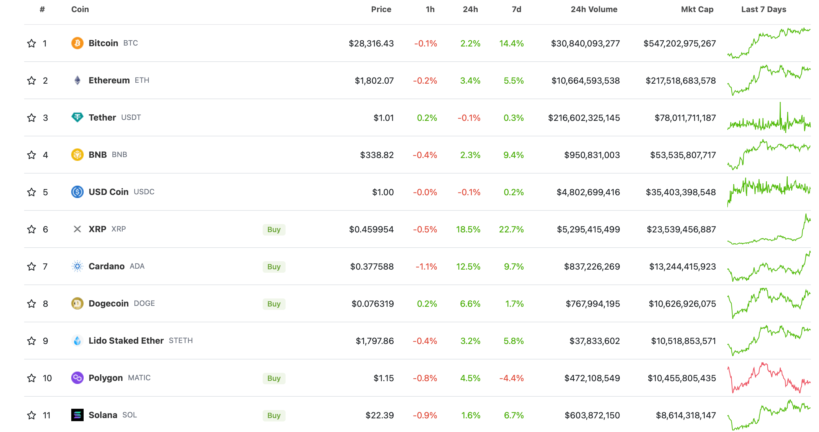 Сегодня рынок криптовалют продолжает находиться в так называемом аптренде, то есть на этапе роста. Биткоин торгуется выше 28 тысяч долларов, в то время как лидером роста за последние сутки оказался токен XRP от проекта Ripple. Он выдал почти 19 процентов роста.