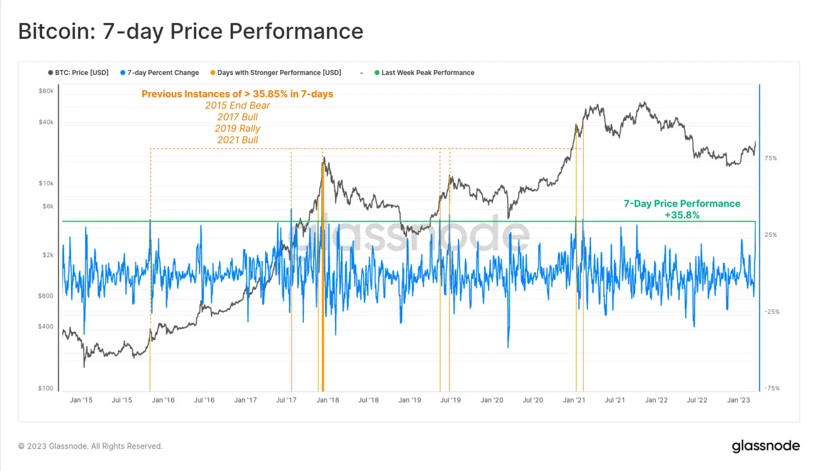 Предыдущая неделя была одной из самых удачных для Биткоина в плане прибыльности, поскольку цена главной криптовалюты за этот период выросла на 35.8 процента. Однако данные аналитиков Glassnode говорят о том, что это ещё далеко не конец ралли. В своём свежем отчёте они указали на несколько факторов, которые являются предвестниками скорого буллрана. Рассказываем о происходящем подробнее.