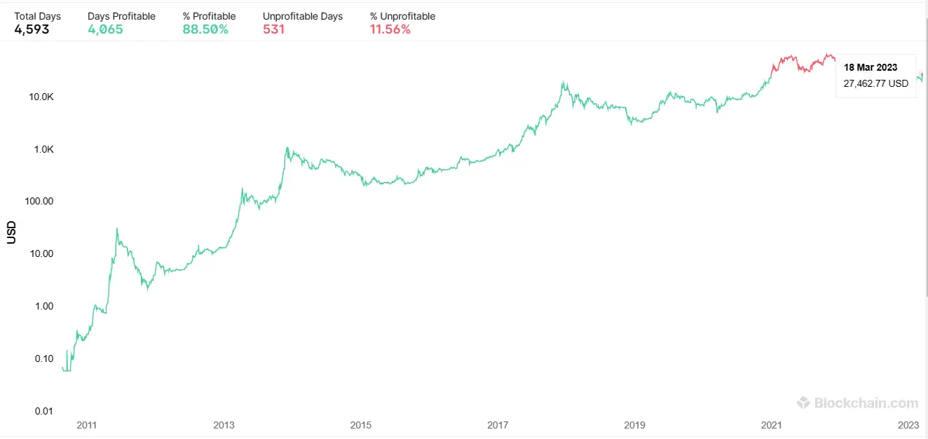 Если оценивать главную криптовалюту более глобально, то показатели становятся ещё более оптимистичными. По данным платформы Blockchain.com, 88.5 процента времени своего существования Биткоин приносил инвесторам прибыль. Если быть более точными, это 4065 из 4593 дней, сообщает Cointelegraph.
