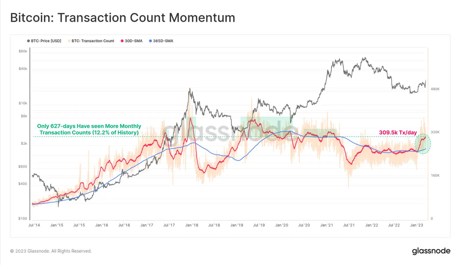 Рост количества транзакций в сутки указывает на увеличение активности в сети Биткоина. Этот процесс является прямым следствием растущего принятия криптовалюты и заинтересованности инвесторов, которое сейчас может быть связано с кризисом в банковском секторе. Последнее также подтверждено рекордным ростом стоимости BTC за неделю.