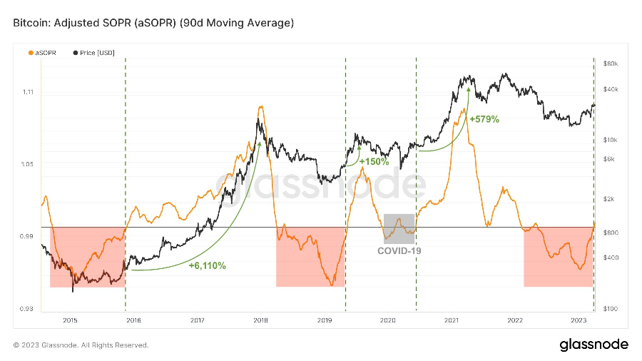 Выводы косвенно подтверждает криптовалютный аналитик Али Мартинес (Ali Martinez). Опираясь на данные Glassnode и ончейн-метрики Bitcoin Adjusted SOPR (aSOPR) Мартинес заявил, что индикатор SOPR, применяемый при анализе долгосрочных тенденций поведения инвесторов, превысил 1. Мартинес напоминает: в 2015, 2019 и 2020 годах аналогичная ситуация привела к росту ВТС на 110%, 150% и 579% соответственно.