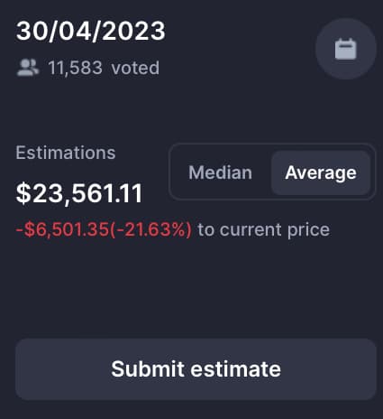 Если оценки 11 583 голосов участников окажутся верными, 30 апреля биткоин будет торговаться по средней цене $ 23 561, что на -21,63% или $ -6 501 ниже текущей цены.