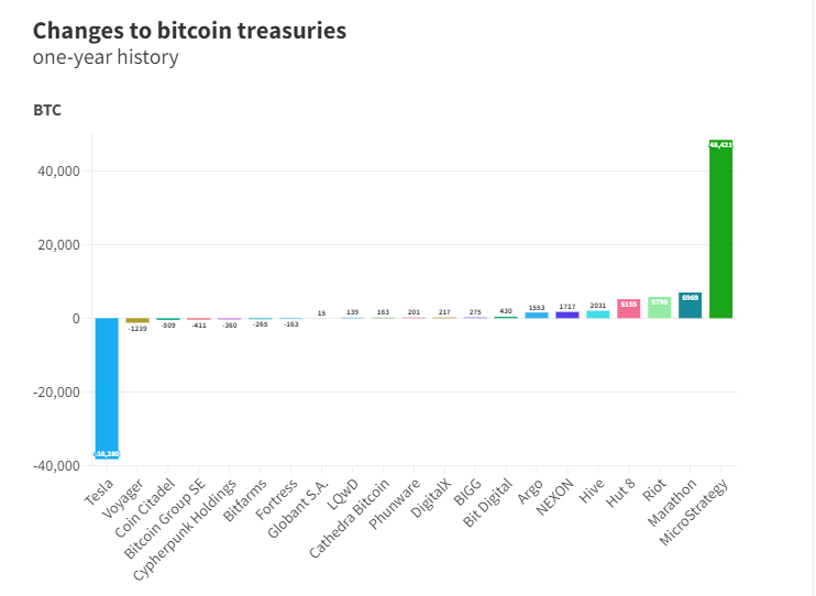 Компания MicroStrategy, специализирующаяся на разработке программного обеспечения, вышла в плюс по покупкам биткоинов. По данным BitcoinTreasuries, с августа 2020 года фирма под руководством бывшего генерального директора Майкла Сэйлора купила 140 000 BTC за $ 4,2 млрд.