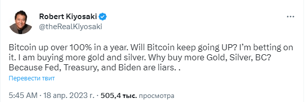 Кийосаки заявил, что крупнейшая по рыночной капитализации криптовалюта «вырастет более чем на 100% за год». В пользу его точки зрения говорит тот факт, что с начала 2023 года цена BTC уже повысилась на 80%.