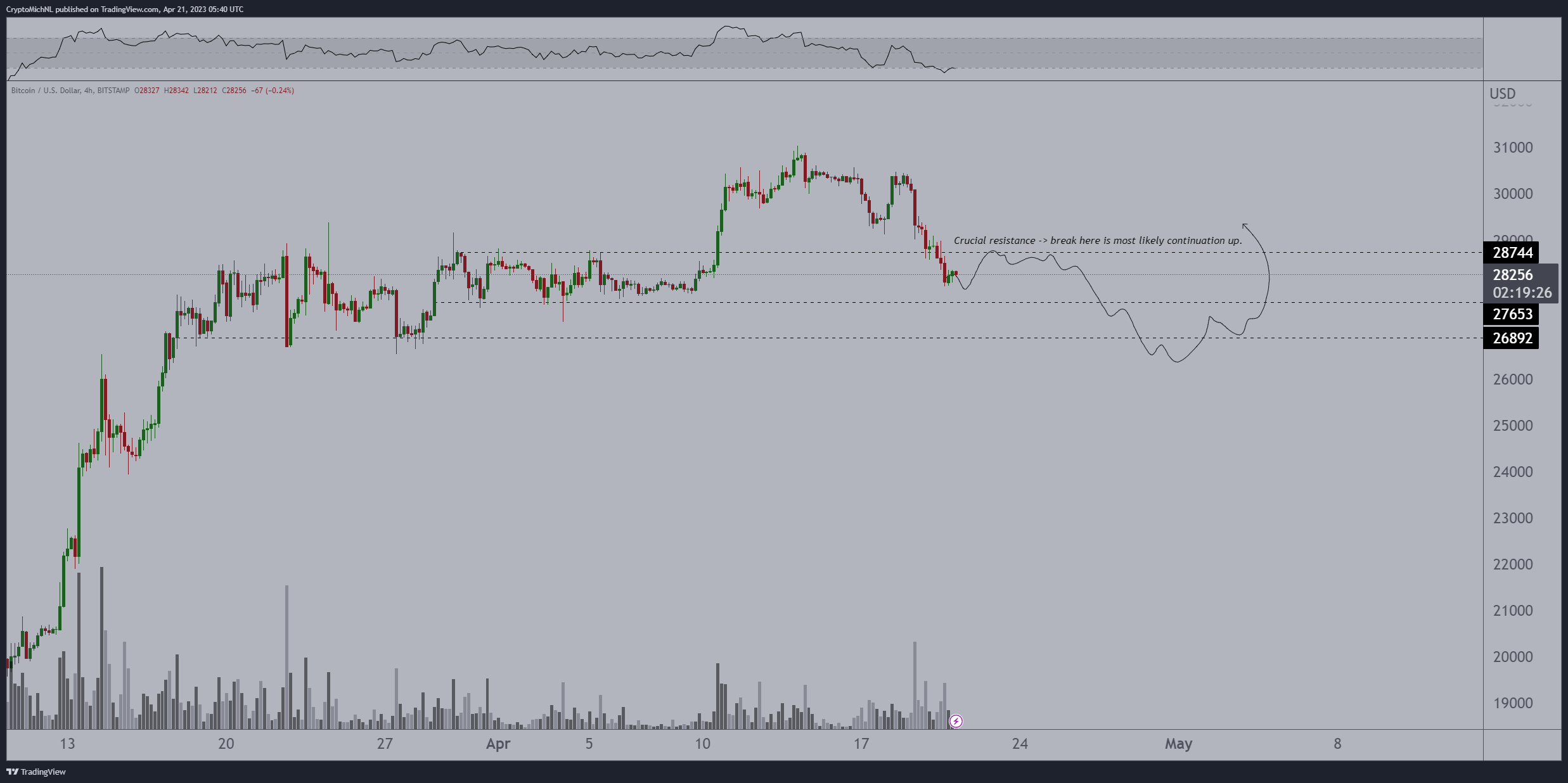 Глава трейдерской фирмы Eight Михаэль ван де Поппе (Michaël van de Poppe) оценил ситуацию следующим образом: «В настоящее время биткоин демонстрирует слабость. Потерял один из решающих уровней и вернулся в диапазон. Важнейший критический уровень соответствует $27 600. Возможно снятие ликвидности ниже с последующим быстрым восстановлением».