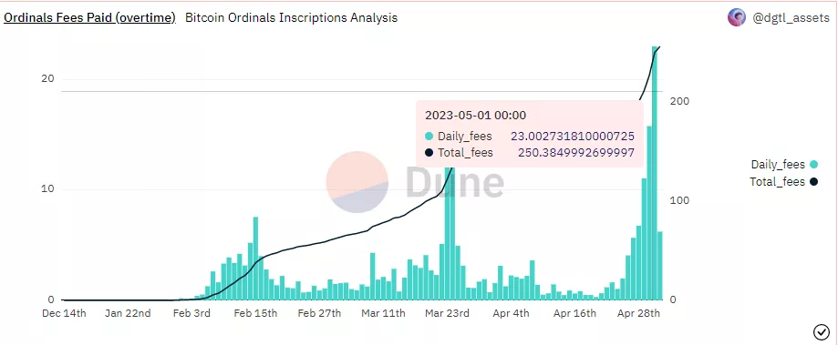 На момент написания всего выпущено 3 130 802 биткоин-NFT, согласно данным дашборда @dgtl_assets на платформе Dune Analytics. На их эмиссию потрачено 256,6132 BTC ($7,2 млн) в виде комиссий.