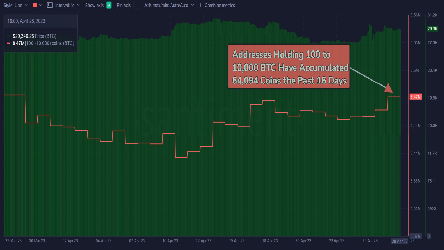 Согласно отчетным данным обозревателя Santiment за апрель, крупные биткоин-инвесторы увеличили запасы активов в первой криптовалюте на 64 000 BTC (около $1,8 млрд).