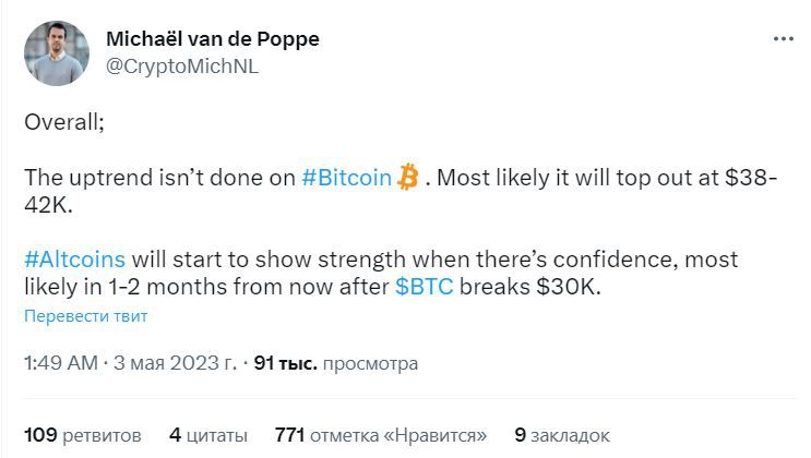 Аналитик Майкл ван де Попп считает, что BTC еще не завершил рост. Его прогноз биткоина подразумевает дальнейшее движение криптовалюты к уровням $38-42 тыс.