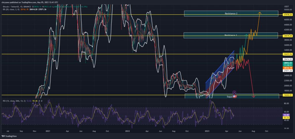 Если же Сопротивление 1 будет препятствовать BTC, он может найти поддержку на уровне 32,4 тысячи долларов. Однако, если поддержка на уровне 32,4 тыс. не сможет стать стартовой площадкой для следующего бычьего роста BTC, мы можем ожидать, что BTC несколько раз протестирует сопротивление 1 и уйдёт во флэт.