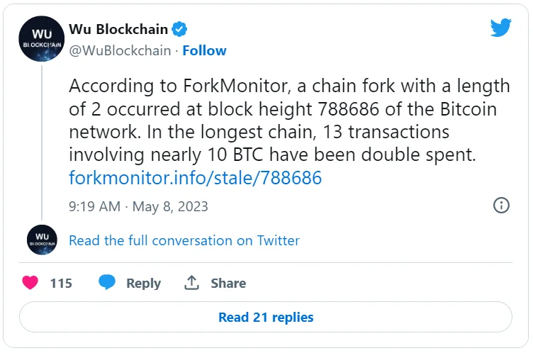 В чем причина форка? По информации Fork Monitor, на высоте 788 686 было выпущено сразу несколько блоков, на каждый из которых в дальнейшем начали опираться последующие блоки по мере их добычи, создавая таким образом конфликтующие цепи. В качестве основной цепи сохранилась наиболее протяженная, а не вошедшие в нее блоки стали устаревшими. При этом в результате разделения цепи транзакция на 10 BTC была обработана дважды, что привело к повторному расходованию средств.