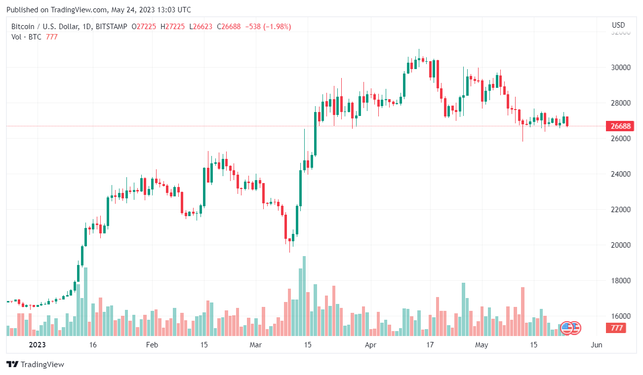 На момент публикации данного обзора крупнейшая криптовалюта торговалась на отметке $26 688. За сутки ее капитализация сократилась более чем на 2% до $518 млрд.