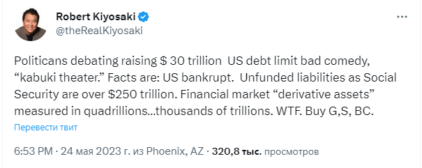 В своих твитах Кийосаки раскритиковал продолжающиеся политические дебаты вокруг предлагаемого увеличения лимита долга США на $ 30 трлн, назвав это плохой комедией.