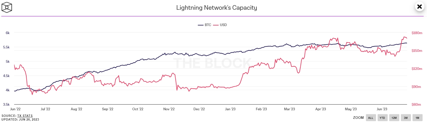 Показатель емкости сети микроплатежей биткоина Lightning Network (LN) достиг максимума в долларовом и криптовалютном выражении, согласно данным The Block.