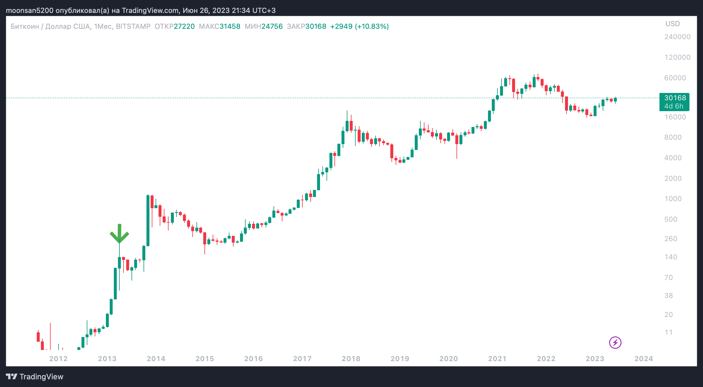 На графике отмечен месяц, в котором Джереми рекомендовал купить BTC