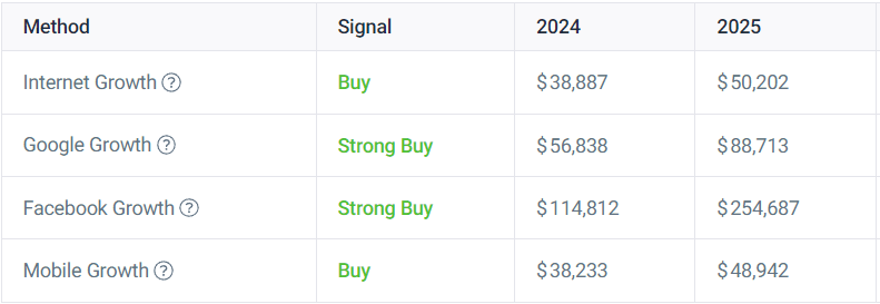 К концу 2025 года, согласно вышеприведённой логике, основная криптовалюта может достичь средней цены в $ 110 636 (+256%). Вероятная цена при повторении тренда интернет-компаний – $50202, если речь идёт о мобильных технологиях – $ 48 942. Следование тренду Google придаст биткоину цену в $ 88 713. При повторении тренда Facebook актив, по оценкам алгоритма, достигнет отметки в $ 254 687.
