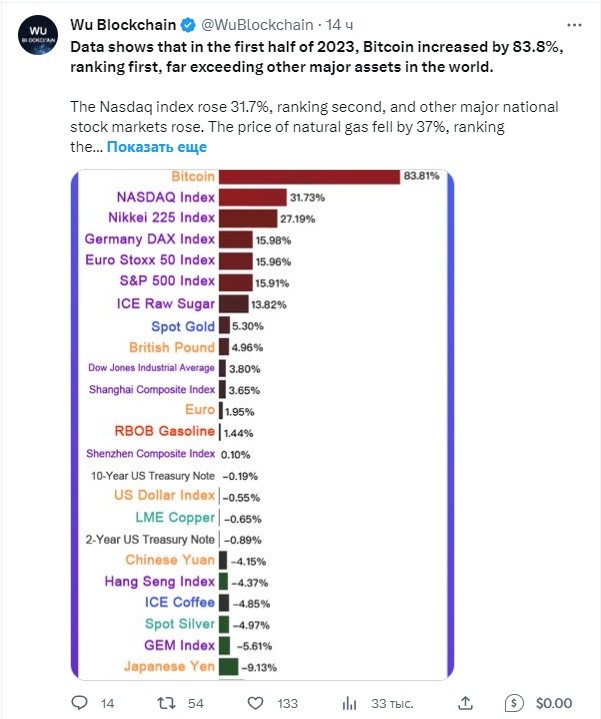 За первую половину 2023 года цена биткоина повысилась на 83,8%, заняв по приросту первое место и значительно обогнав основные мировые активы.
