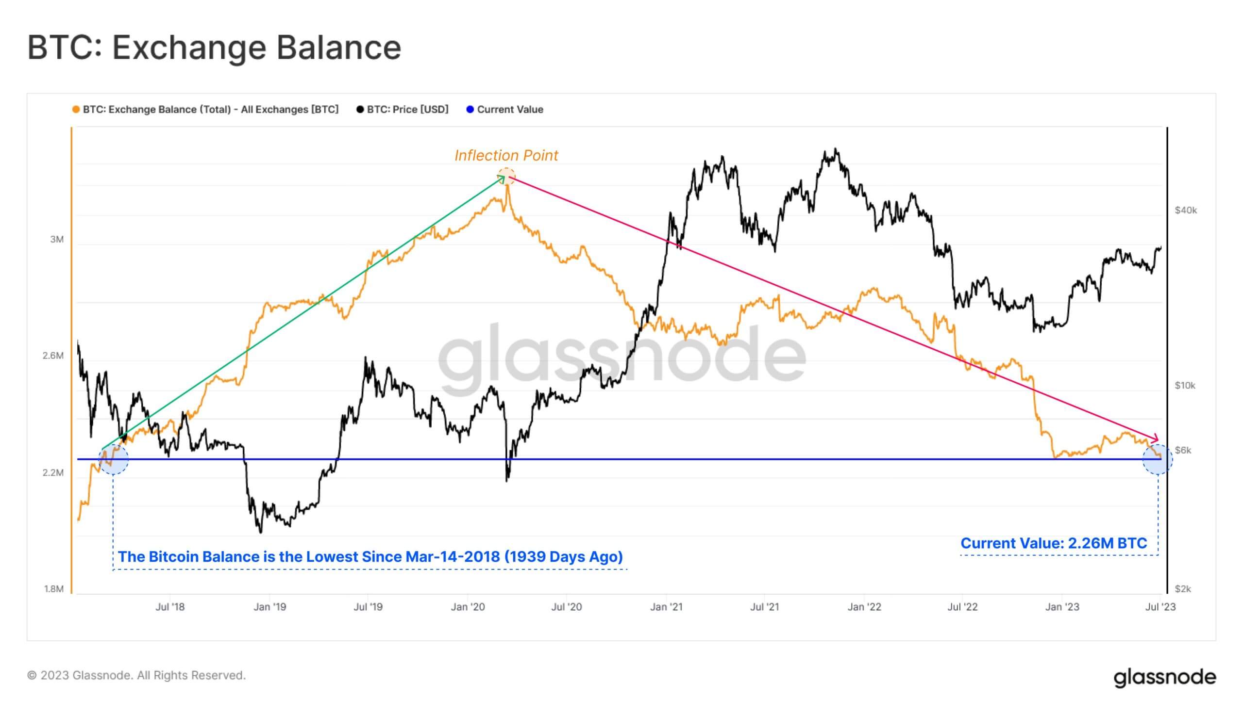 Среди держателей $BTC тем временем увеличивается популярность хранения монет на личных некастодиальных кошельках. В пользу этого говорит баланс биткоинов на криптовалютных биржах, который сейчас опустился до 2.26 миллиона монет. В последний раз такой уровень был зафиксирован в марте 2018 года во время предыдущего медвежьего тренда.