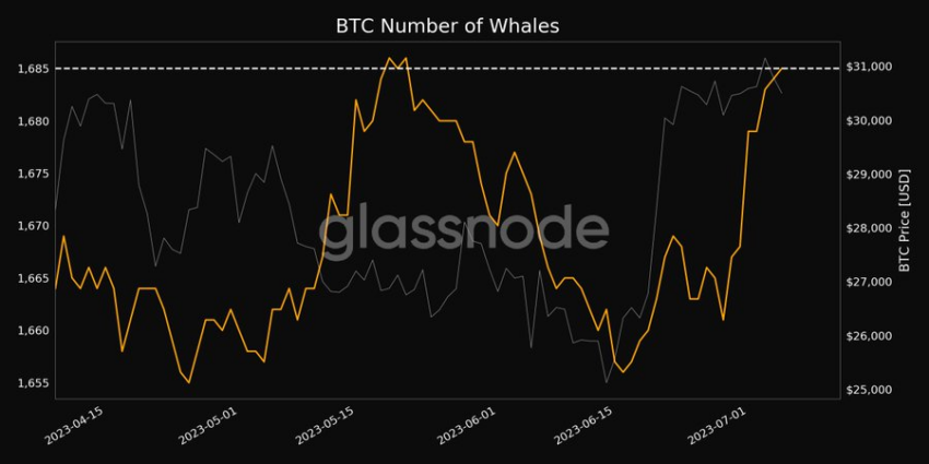 Аналитическая платформа Glassnode подтверждает возросший интерес институционалов к главной криптовалюте. Согласно ее данным, 7 июля количество адресов с балансом от 1 000 BTC достигло месячного максимума – 1 685.